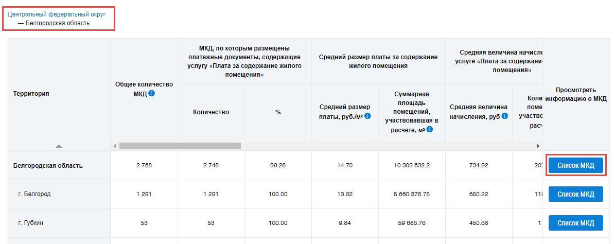 об условиях отображения данных в столбце.Для просмотра информации о МКД нажмите на кнопку Список МКД. Отображается информация о МКД на выбранной территории.