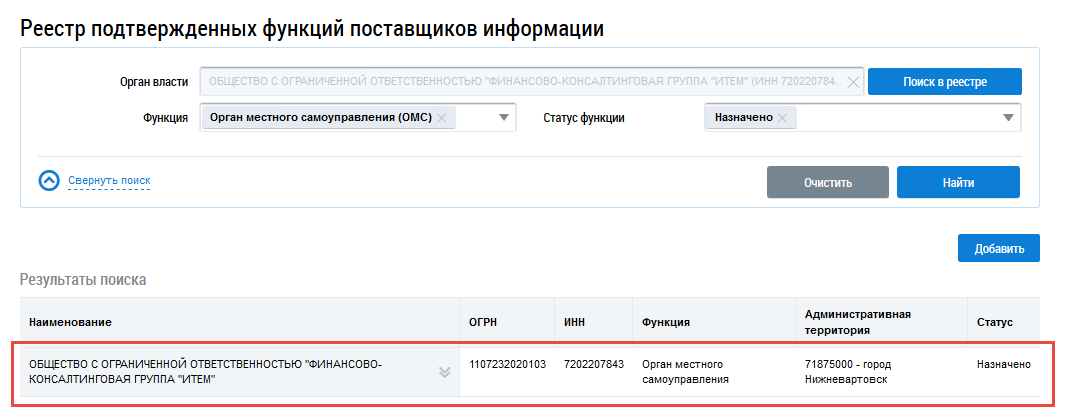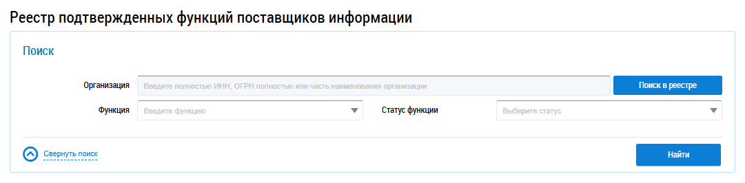 Для поиска по реестру подтвержденных функций поставщиков информации заполните одно или несколько полей блока поиска и нажмите на кнопку Найти. Чем точнее будут заданы критерии поиска, тем уже будет выборка результатов.