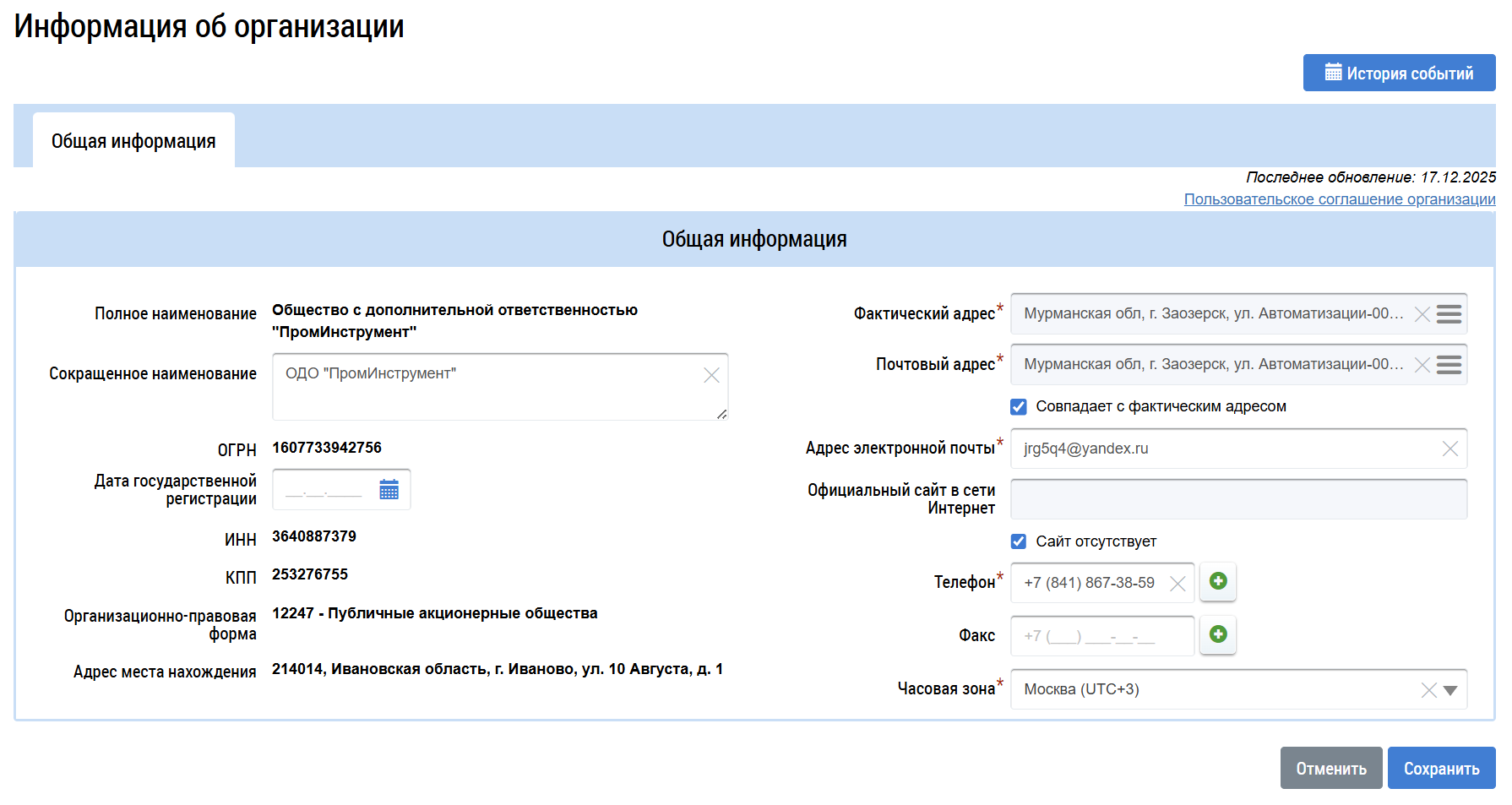 Часть полей на вкладке Общая информация заполнена данными, указанными при регистрации организации в ЕСИА. К этим полям относятся: